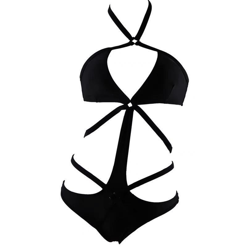 This sophisticated black one-piece swimsuit features a monokini style with striking geometric cutouts and a halter neckline. The artistic strappy design offers modern elegance, making it a standout choice for poolside glamour.
